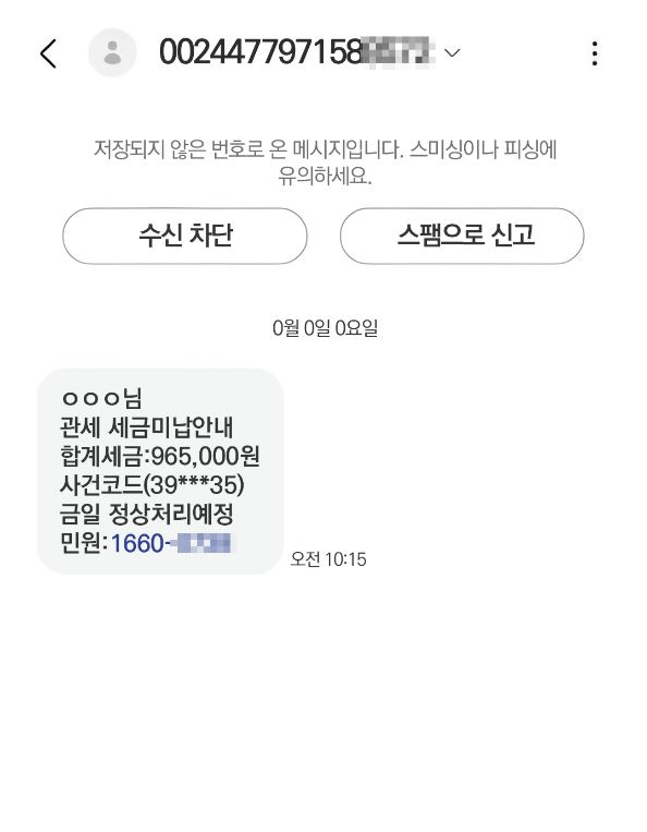 이들은 관세청을 사칭해 전화를 걸게 하거나, 링크 클릭을 유도합니다.