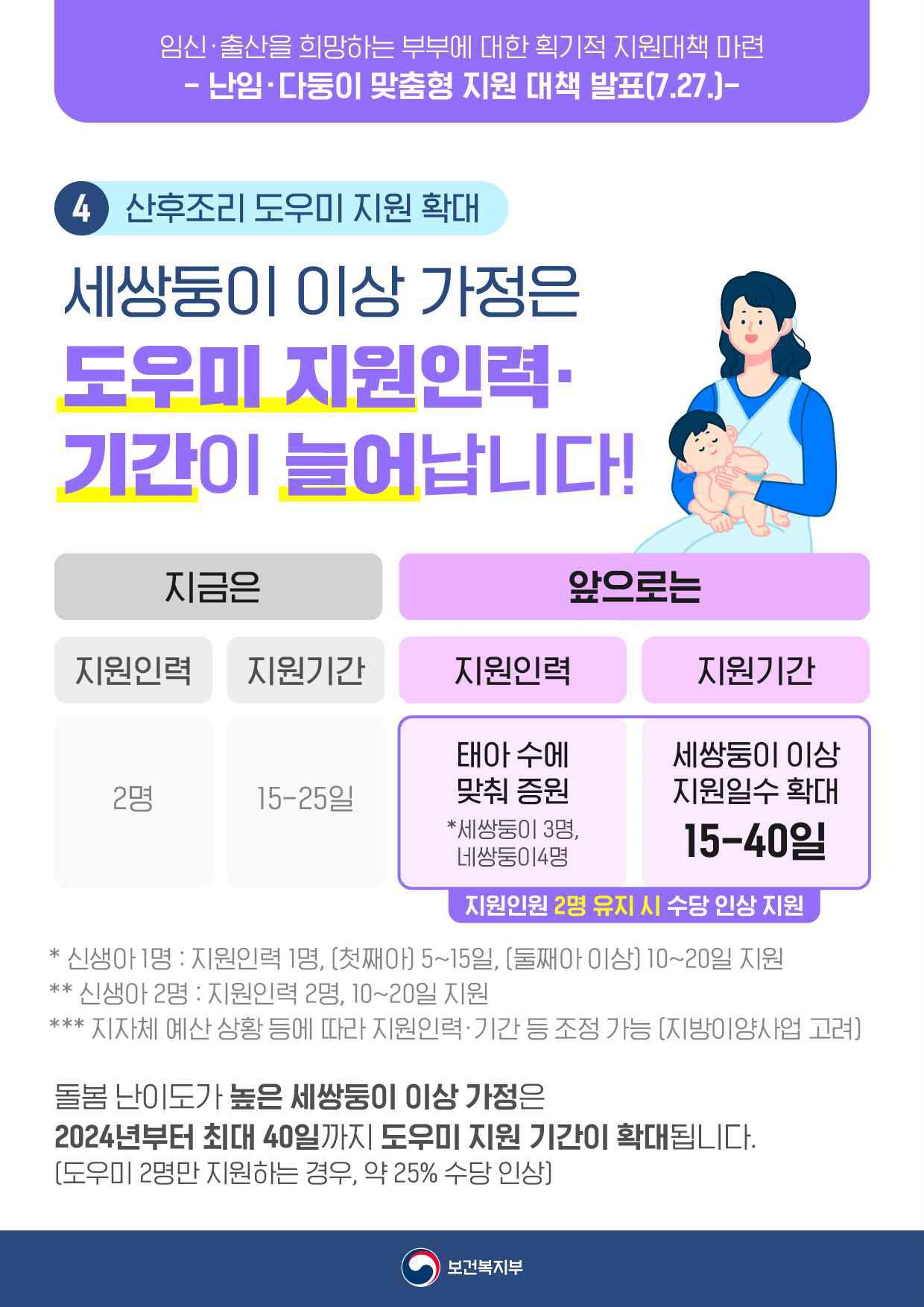 세 쌍둥이부터 2024년 도우미 지원기간을 최대 40일까지 확대하며 태아수에 따라 지원인력도 증원할 예정입니다.