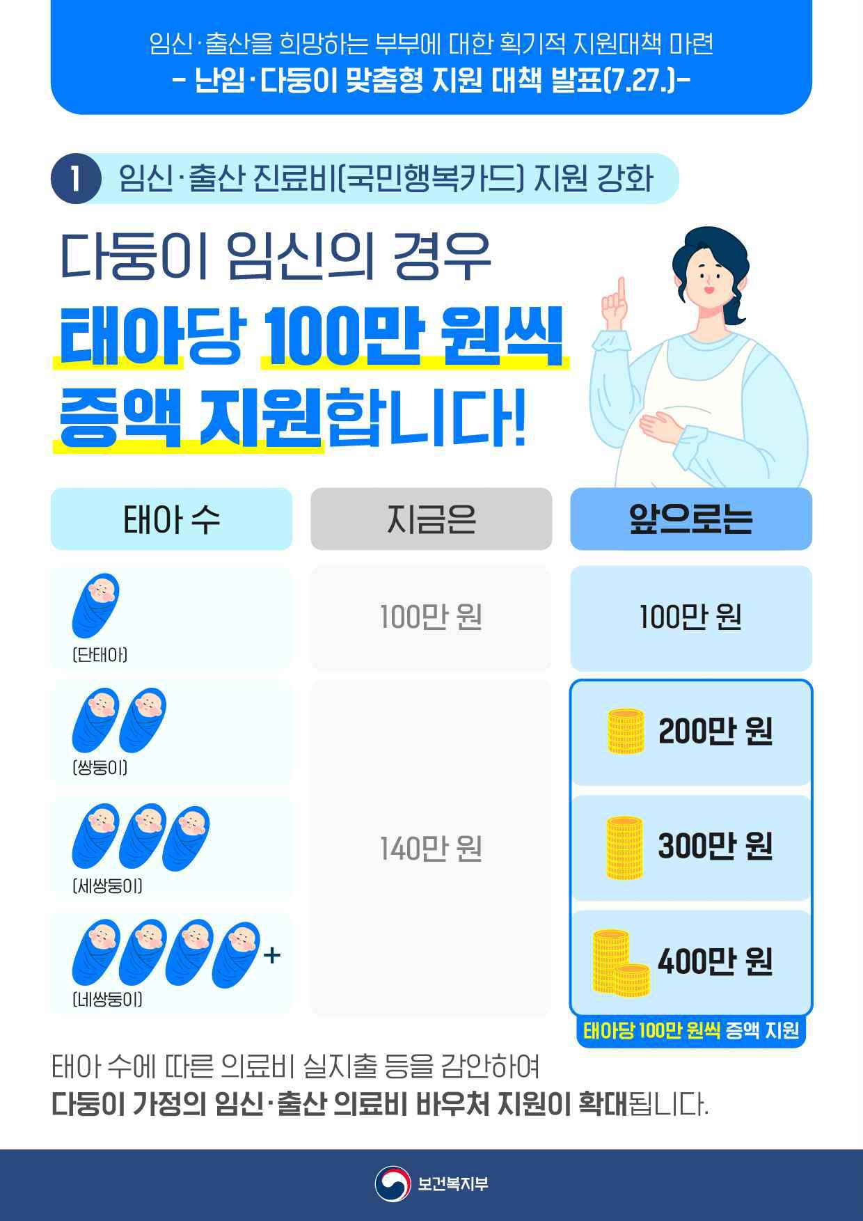 특히 다둥이 임신일 경우 태아당 100만 원씩 증액 지원을 발표하였습니다.