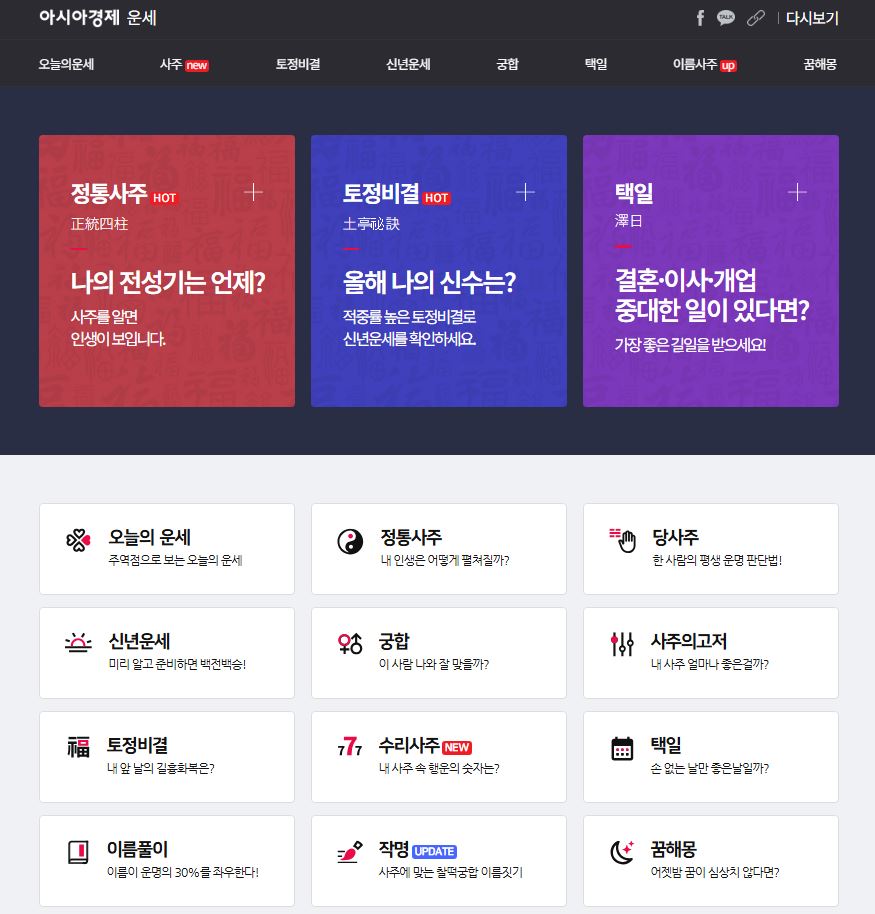아시아경제 사주, 운세! 무료토정비결부터 작명, 이름풀이, 무료궁합, 재물운, 결혼택일, 이사방향, 작명, 꿈해몽, 행운의 숫자 등 유명 역술가의 적중률 높은 결과를 통해 미래를 예측하고 대비